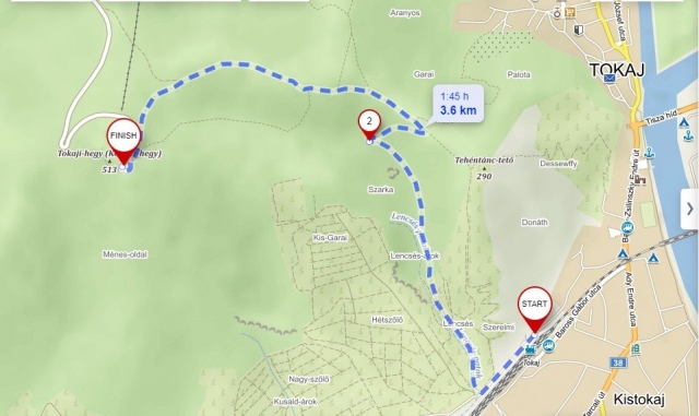 Tokaj vasutállomástól kezdjük a túrát és szemközt a zöld vízszintes turistajelzést keressük, amely a borospincék előtt folytatódik és jobbra a szőlőbirtokok irányába vezet. A zöld vízszintes turistajelzést követjük egy ideig a Lencsés-patak, majd a Lencsés-árok mentén egészen addig míg utunkat keresztezi a piros vízszintes turistajelzés. A hegy oldalából itt csodálatos látványban lesz részünk, tiszta szép időben látszik ahogy a Bodrog eléri a Tiszát. Tovább haladva a Tokaj-hegy irányába az út egyre emelkedik és a piros háromszög jelzésben folytatódik. A Kopasz-hegy (513m) tetején áll a 112 méter magas Tokaji Tv-torony, mely 1960-ban épült és 2013 végig TV-URH gerincadó állomásként működött. Ugyan kilátóként nem üzemel, de tiszta időben gyönyörű kilátás nyílik szinte az egész Hegyaljára és az Alföldre. |