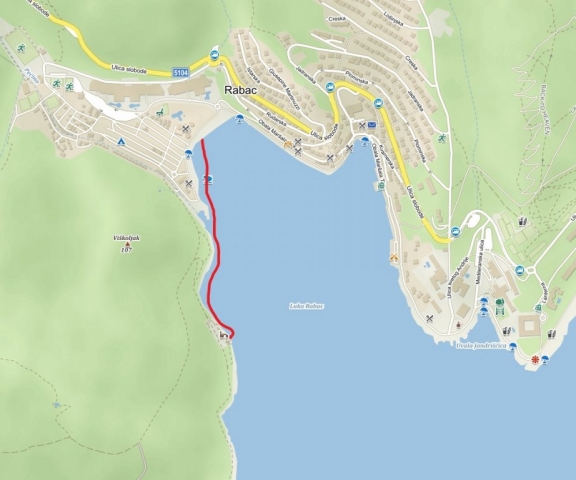 Rabac kikötőjében található a Teleferika egykori betonváza. Ez az egykori bauxitbányászatra emlékeztet, annak is a hajóra rakodáshoz használt épületére. Mára már csak turista látványosság. Rabac strandján mártózunk a tengerbe és a jobb oldali partot követve elúszunk a jól látható Teleferika betonvázához. Az épület még mindig érdekes látványosság a tengerpartján. Miután kinézelődtük magunkat vissza úszunk a strandra. |