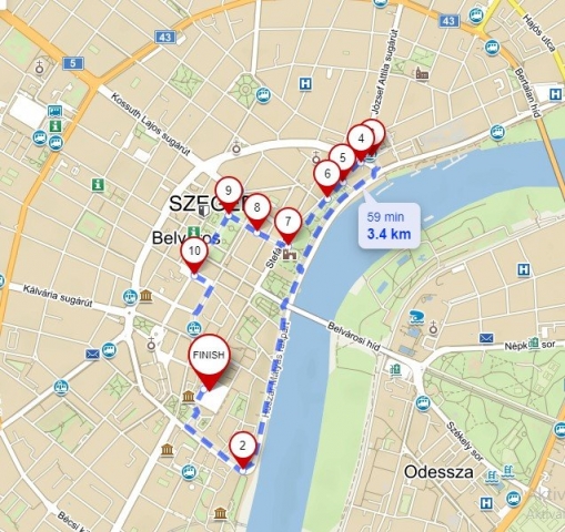A szegedi rövid városi körséta a Dóm tér felől indul és a Tisza part érintésével a Fogadalmi templomnál, azaz a Magyarok Nagyasszonya-székesegyháznál, ismertebb nevén a Szegedi dóm monumentális épületénél ér véget. A térről a dóm bejáratával szemközti kapun sétálunk ki, az Aradi Vértanúk tere felé, majd a Tisza Lajos körúton lesétálunk a Huszár Mátyás rakpartra. Elsőként az Árvízi emlékművel találkozunk a Tisza partján, melyet 1979-ben létesítettek az 1879-es árvízkatasztrófa emlékére. Innen a partot merőlegesen keresztező Belvárosi híd irányába haladunk tovább és egészen a Belvedere palotáig sétálunk, ahol balra fordulunk és az épület másik oldalán, a parkokkal tűzdelt Stefánián folytatjuk utunkat. Érdemes útba ejteni a Várkertet, az itt álló várromot és a Móra Ferenc Múzeum patinás épületét. Utunkat a Vörösmarty utca irányába folytatjuk és onnan balra fordulva előbb a Széchényi téren, majd a Klauzál téren sétálunk keresztül, majd a Szent Györgyi Albert tér mellett elhaladva az Oskola utcába érünk, ahonnan már jól látható a Szegedi dóm épülete. Az épület a Szeged-Csanádi egyházmegye főtemploma, tornyainak 81 méteres magasságával az ország 5. legmagasabb temploma, a város arculatának egyik legmeghatározóbb épülete, egyben Magyarország egyetlen 20. században épült neoromán stílusú székesegyháza. A Tisza felőli tornyában található a Szent Gellért harang, más néven Hősök harangja, mely a legnagyobb átmérőjű és a legmélyebb hangú harang az országban. A Szegedi dóm rendelkezik Magyarország legnagyobb toronyórájával. Az óralapok 4,3 méter átmérőjűek, az óra mutatói pedig 2,7 és 2,1 méteresek. A túra bármelyik irányból elkezdhető, a teljes kör megtételével érvényes a teljesítmény. |