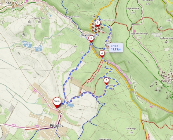 A gyalogtúra a Hősök terén álló Kisboldogasszony templomtól az Országos kéktúra jelzésen indul, majd folytatódik a horgásztó mellett, ahonnan kellemes gyalogúton haladunk tovább a falu végén található Pincefaluig. A hegy lábánál fekvő, közel 300 házból álló pincefalut bájos házacskái és hangulatos kis utcái tesznek különlegessé a hagyományokat tisztelő turisták számára. A falutól a piros kör jelzésen Szent Orbán a szőlőhegyek védőszentjének szobra felé vesszük az irányt, majd a piros háromszög jelzésen folyamatosan emelkedő erdei ösvényen elindulunk a Basina tetejére. A hegytetőről csodálatos panoráma tárul elénk, a távolban pedig jól látható a Nagy-Gerecse valamint pazar kilátás nyílik a szomszédos Kétágú-hegy, és a Klastrom-szirt sziklái felé. a szirtre és tovább indulunk a sárga kereszt jelzésen a Basina-völgy irányába. A völgybe érve elsőként a Szontagh Ottó tiszteletére emelt kopjafával találkozunk, majd jobbra letérve elérjük az Eszperantó-forrást és a Pilisi Parkerdő bivakszállását. Rövid pihenő után a sárga kör jelzésen indulunk el, majd az azt keresztező piros sáv jelzésű erdészeti úton haladunk tovább a Csévi-szirtek felé. A Vörös útnak elnevezett ösvényről balra térünk le a zöld kereszt jelzésen és megérkezünk a Klastrom-szirtek felé. Innen kis kitérővel megnézhetjük a Kémény-sziklát, ahonnan pompás kilátás tárul elénk Klastrompusztára és az Ariadne-barlangrendszert alkotó Leány-és Legénybarlang, a Csévi-szirtek irányába. A hegyről a sárga sáv jelzésen ereszkedünk le Klastrompusztára, majd a Pálos kolostorromtól az Országos kéktúra jelzést követve érjük el kiindulási pontunkat. |
