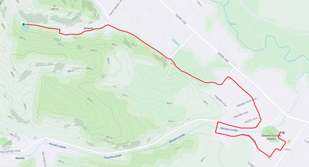 Berentei-tótól indulva, szinte végig lefelé vagy vízszintesen tekerünk Sajószentpéterre (bányász emlékműig). Egyenesen haladva eljutunk Sajószentpéterre, utána a jobbra kanyarodva eljutunk az Alacska felé vezető útra, itt is jobbra. Majd a falu vége előtt a kanyarban balra haladunk. Innen egy darabig ezen az úton, el a házakig, majd ott pár kanyar után eljutunk a célig. |